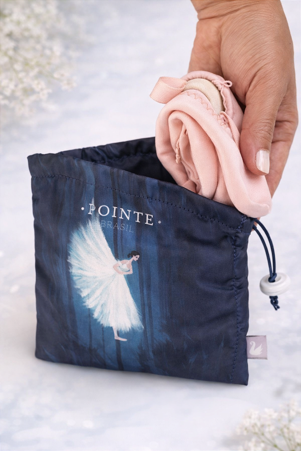 A embalagem inclui 1 bolsa de sapatilha azul-marinho com estampa temática da Pointe Brasil.